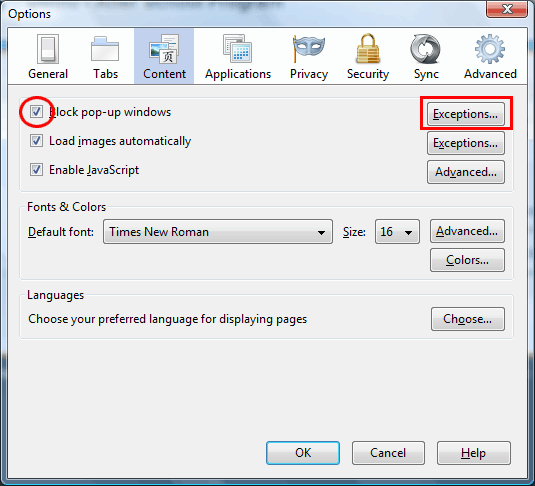 Once you click on the menu, you will see the Options window. Check on checkbox for "Block pop-up windows" and then click on "Exceptions" button as displayed in Figure-6A.