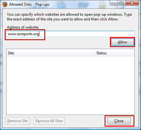 Type the name of the website (e.g. www.ezreports.org) into Address of web site box in Allowed Sites - Pop-ups window. Then click "Allow" and then "Close" button as displayed in Figure-6B