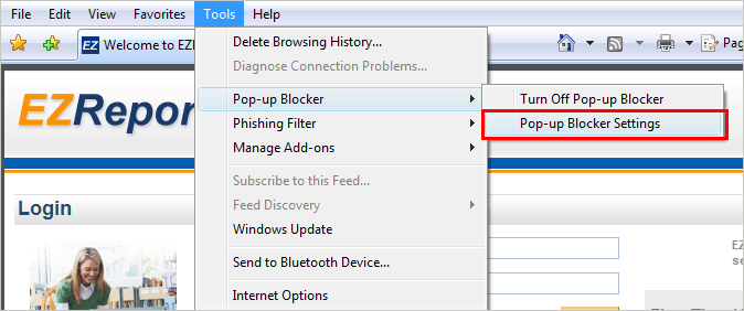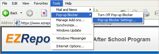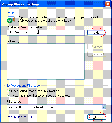 Type the name of the website (e.g. www.ezreports.org) into Address of web site box in Allowed Sites - Pop-ups window. as displayed in Figure-7B. Then click "Add" and then "Close" button as displayed in Figure-7B.