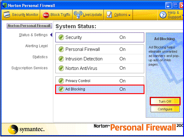 1. Open Norton Internet Security's/Firewall's main window (you may click the firewall icon on the system tray or use Start->Programs->Norton Firewall)