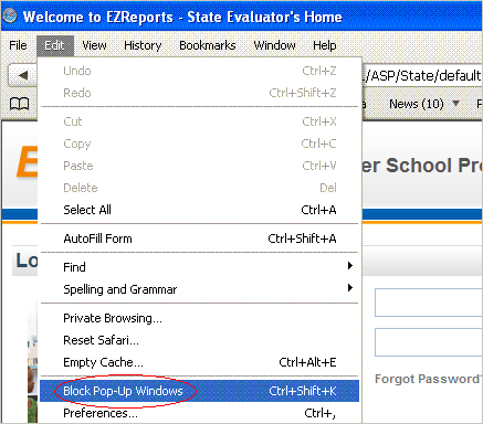 from your internet browser. If you are using Apple Safari as your browser, you will see the toolbar displayed in Figure-9. Please click "Edit" and make sure "Block Pop-Up Windows" is unchecked as displayed in Figure-9. |